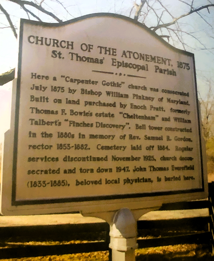 In 1874 a “Carpenter Gothic” church was built on land purchased by Baltimore philanthropist Enoch Pratt, formerly Thomas F. Bowie’s estate “Cheltenham” and part of William Talbert’s “Finches Discovery”. Pratt made a generous donation to the construction of the new church as did Dr. Skinner and the Rev. Mr. McKenney. The church perhaps was built to compliment what was then the House of Reformation & Instruction for Colored Children later known as Boys Village, a spiritual component to youthful rehabilitation. This would have been consistent given St. Thomas’ then rector, Samuel R. Gordon’s (rector 1852-1883) work with the local African-American community. Bishop William Pinkney of Maryland consecrated the church in July 1875. A bell tower in memory of Rev. Gordon was constructed in the 1880s. The cemetery was laid off in 1884. Regular services were discontinued in November 1925. In October 1947 the vestry voted to remove the building. The building was taken down and the only vestige of the building that remains are the concrete steps once leading up to the entrance of the church.